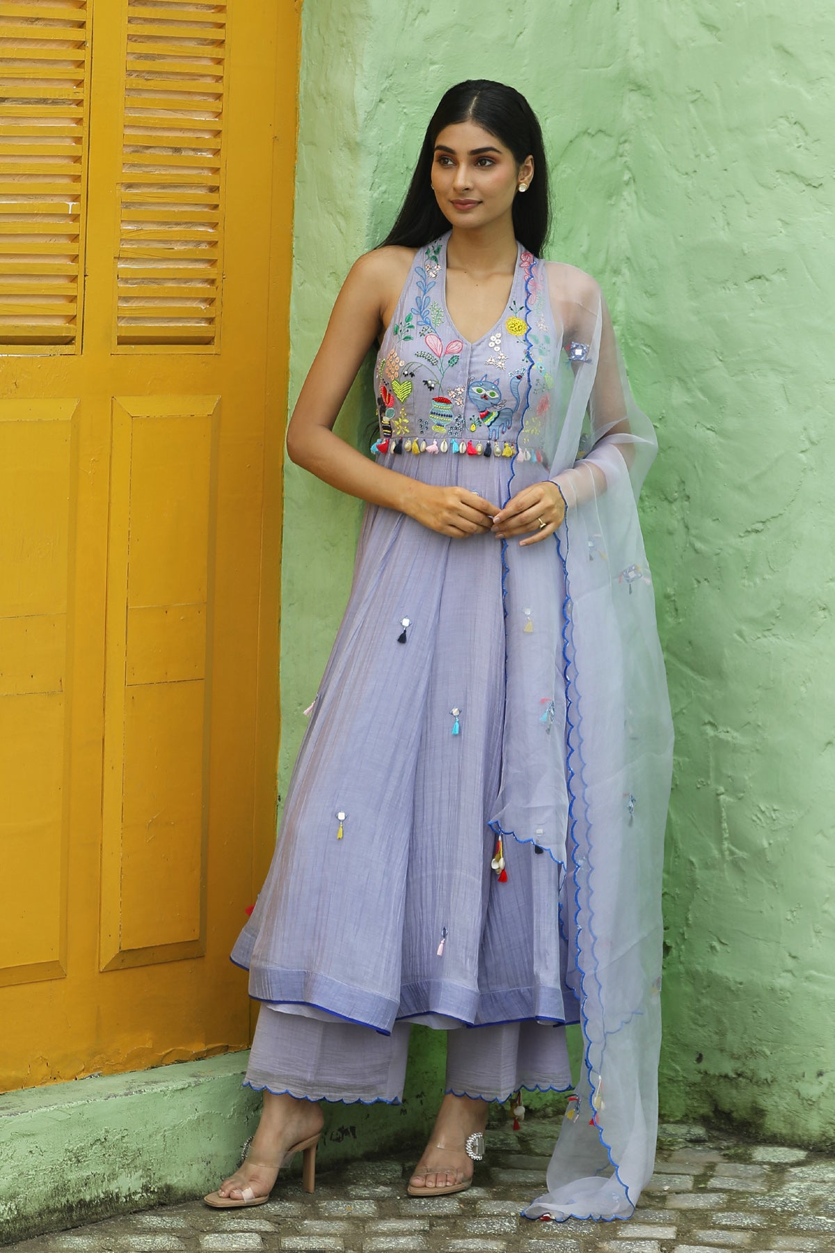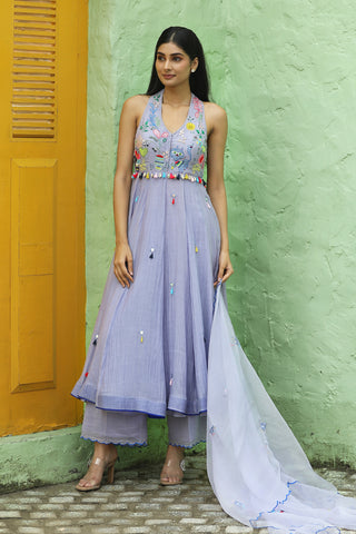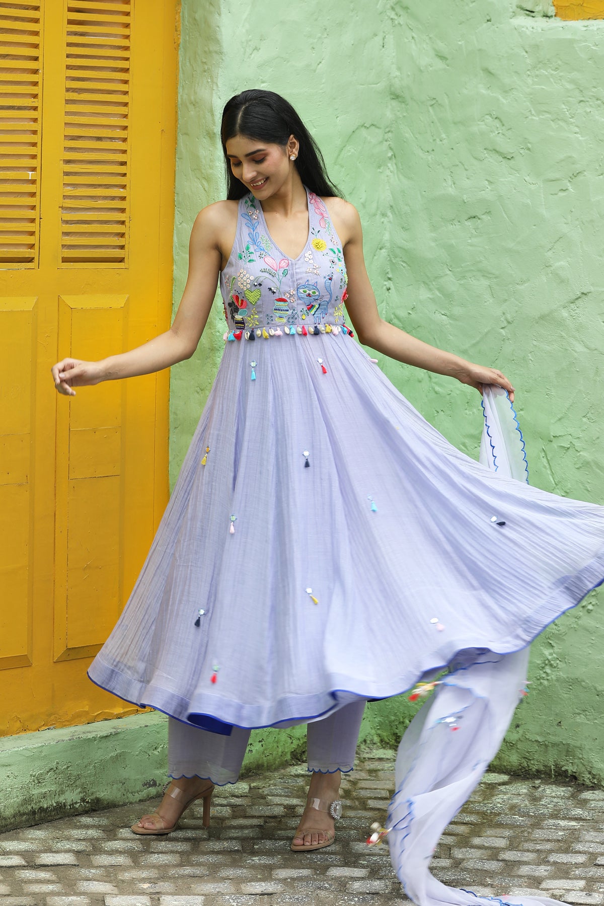 Iice Blue chanderi anarkali embellished with multicolor patch & motti work yoke ,beautiful tussals on waist line paired with cutwork pallazo and orgenza patara work dupatta