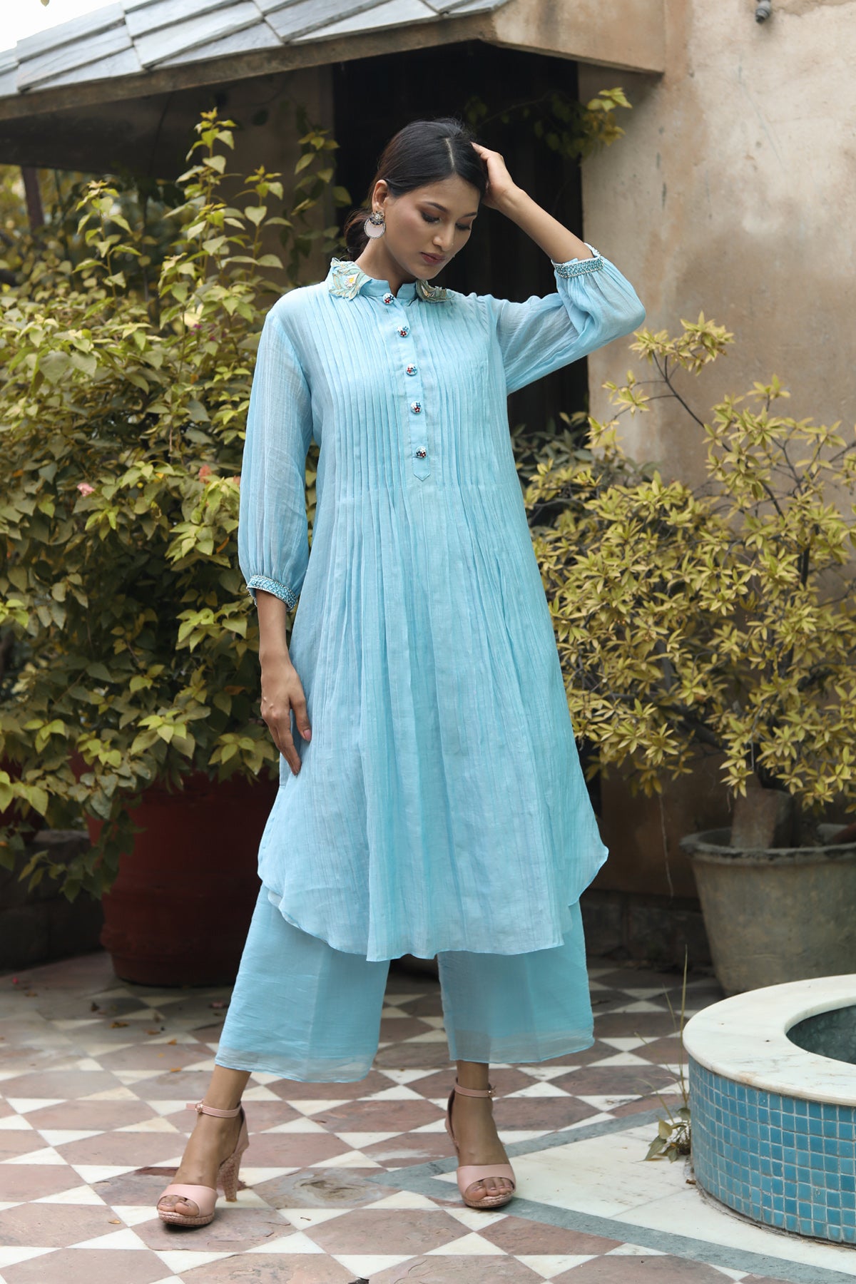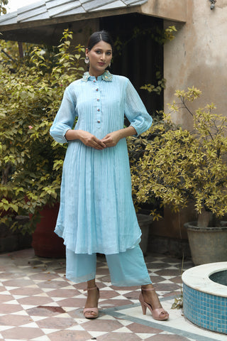 Showcasing ice blue handwoven chanderi pleated kurta with resham, beads, sequins and patch work embroidery on collar handmade buttons on plackit, paired with plain chanderi pant.